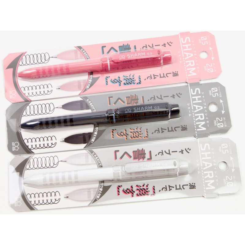 The Sharm multi function pencil holds a .5mm mechanical pencil unit and a 2.0mm eraser unit. You twist the barrel to change from pencil to elastomer eraser.Choose from Pink, White, or BlackRefillable eraserRecommended lead refill