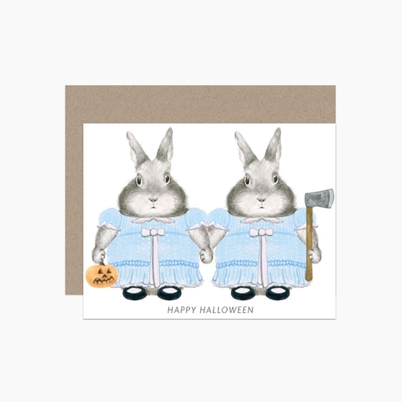 Two bunnies dressed up as the twins from the Shining with text that reads "Happy Halloween"Size A2 (4 " x 5 ")Printed on soft white paper and paired with a kraft envelope.Blank interior