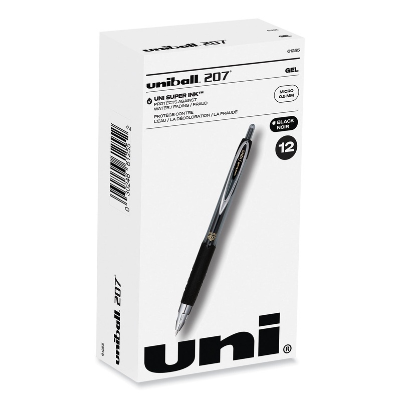 Stock your office, home or classroom with 207 Retractable Gel Pens from uni-ball available in various point sizes with a stainless steel tip that resists bending and breaking. Even-flowing, pigment-based gel ink delivers a smooth writing experience for intense, vibrant lines, ensuring that every mark is brilliantly communicated. Use these retractable gel pens for everyday writing tasks, check signing and all of your important signatures, trusting its quick-drying uni Super Ink. Innovative uni Super Ink technology effectively entraps the gel ink into the paper, producing fraud, fade and water-resistant documents that resist check washing or bleaching. A textured grip offers greater comfort and control as you continue writing, while a translucent ink window indicates the level of gel ink remaining, so you don’t run out unexpectedly. The sleek design of the 207 with modern metal accents gives the retractable gel pen a stylish touch. Pen Sub-Brand & Product Family: Signo 207; Pen Type: Gel Pen; Pen Style: Retractable; Pen Tip Type: Conical.