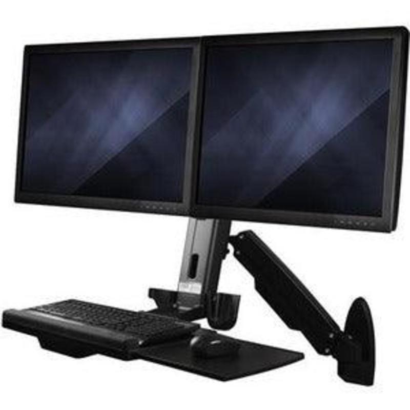This wall-mounted sit-stand desk for dual monitors is perfect for areas that don’t have enough space for a traditional sit-stand desk. Its compact, wall-mounted design combines a dual-monitor arm and a keyboard tray, with easy height adjustments that let you alternate between sitting and standing without disrupting your workflow.