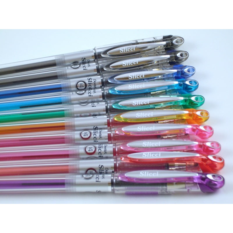 The Pentel Slicci might just be our favorite gel pen! The Slicci has a super slim barrel with a needle-fine tip and bright smooth gel ink that dries quickly.Available in 3 different sizes: .25, .3, and .4Available in 21 colors (Update: All colors are being