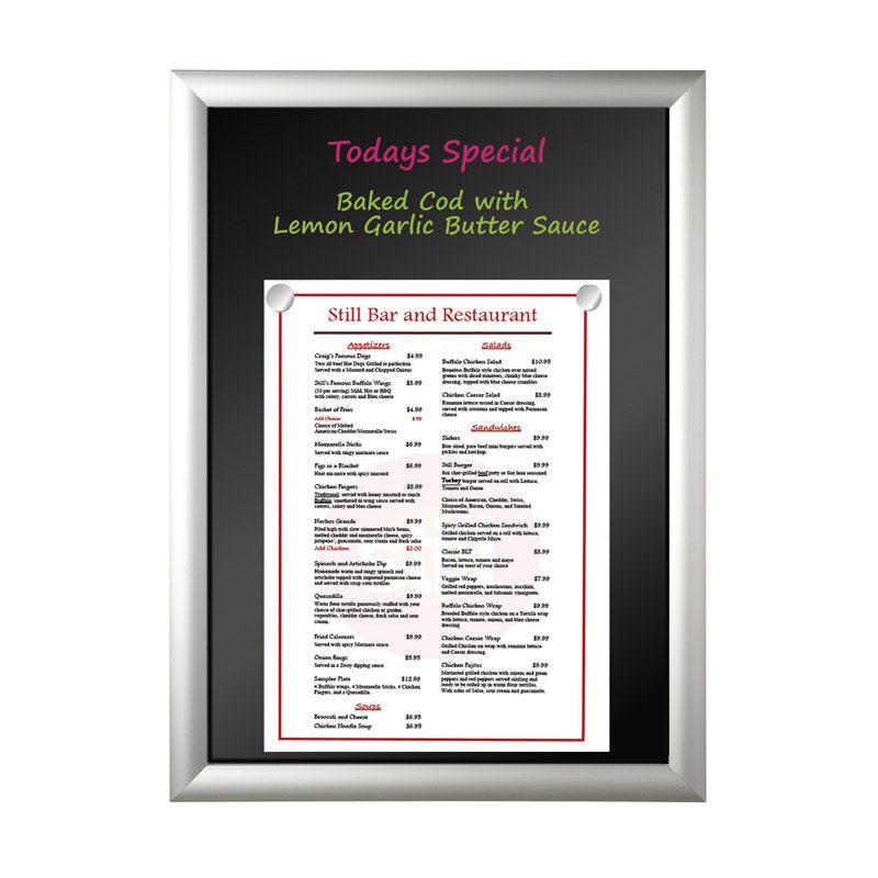 Three display solutions in one! The magnetic, black surface works great with special, wet-erase pens (not included) for eye-catching graphics. Perfect for posting “specials of the day” or important notices. The magnetic surface is also great for posting sheets and notices using magnetic accessories. This frame also features spring-loaded frame pieces so 16 1/4″w x 22 3/4″h inserts can be quickly and easily changed. Clear insert is included to protect display materials from dirt, moisture, and debris.
