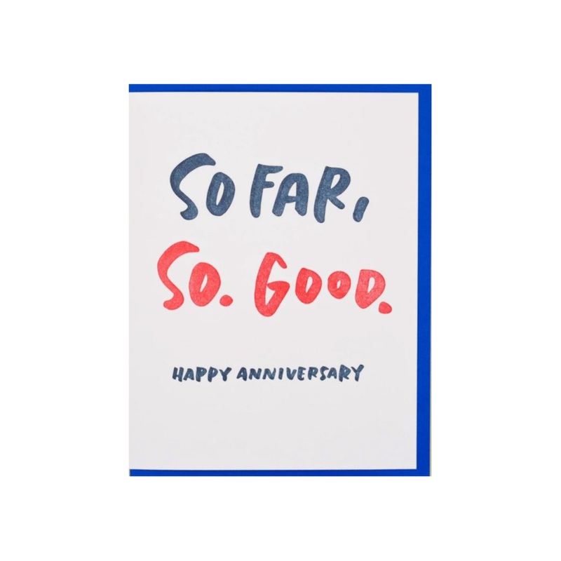 Who says anniversary cards need to be frilly or sappy? So far, SO. GOOD.Folded card measures A2 (4.25" x 5.5")Letterpress printed on 100% cotton paper
