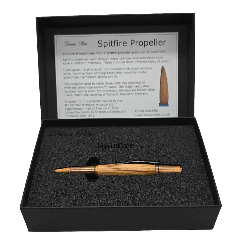 The propeller used to make these pens was constructed from the Weybridge spruce/fir wood. The blade had a steel covered leading edge. For protection, the wooden blades oftenhad a plastic like covering of Rotoloid, Rayoid or Schwarz.