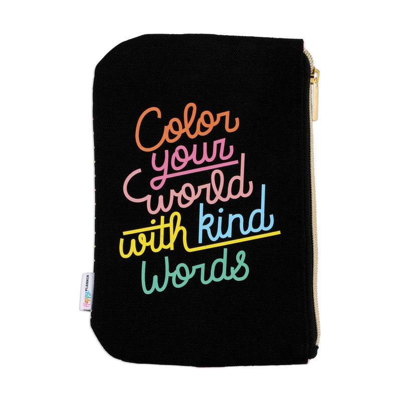 Keep all your planning necessities on hand! This canvas pouch features multicolored lettering with the message "Color your world with kind words" against a black background. The back has colorful stripes. The pouch has a pink band that wraps around your Ha