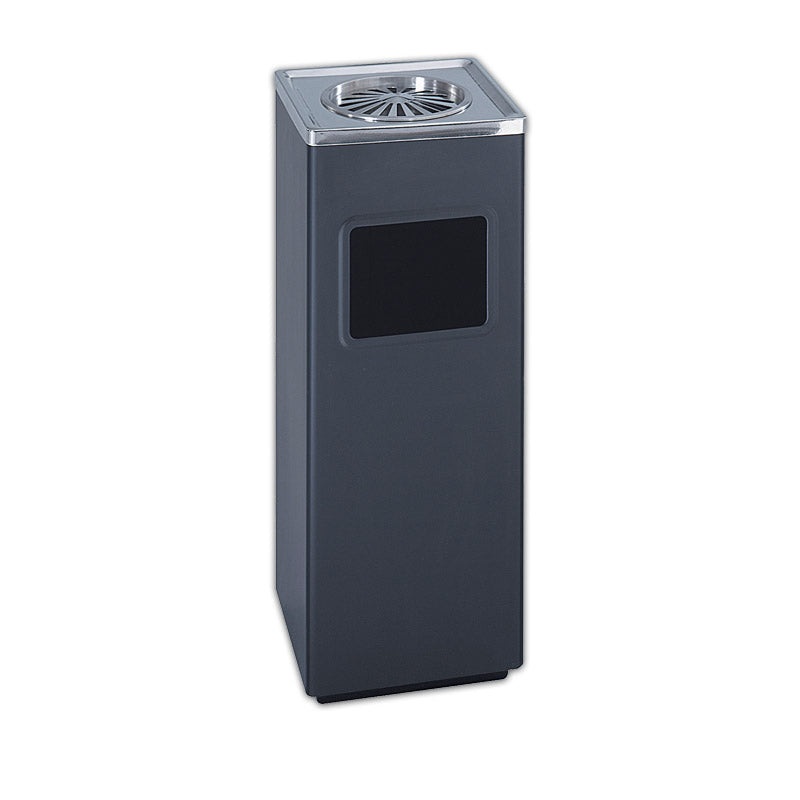 Features3 gallon capacityDesigned for outdoor use Ash urn is built inBlack, powder-coated steel base with chrome accentsSandless ash urn features a slotted snufferDetailsThe Square Ash and Trash Receptacle is a 3-gallon, outdoor trash can with ash urn buil