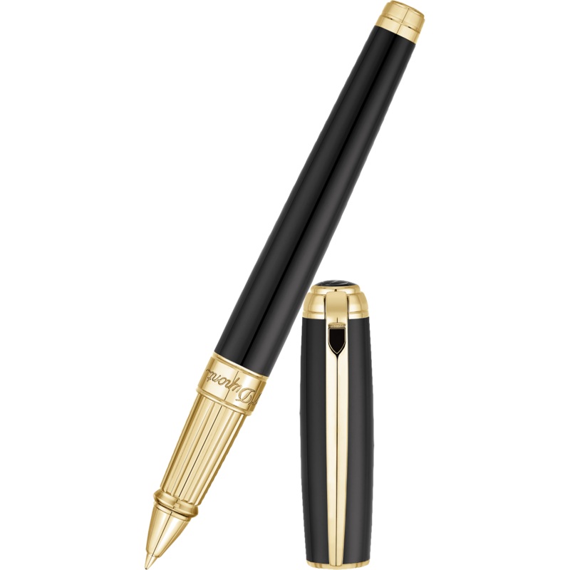 ST Dupont Line D Large Black with Gold Trim Rollerball Pen. Crafted with black natural lacquer and designed with yellow gold trim, the pen ensures pleasurable writing experience for all pen lovers. Features excellence weight for your hand held.