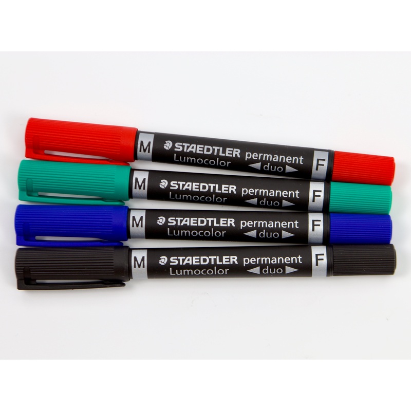 The Staedtler LumoColor permanent marker is a duo markerwith a medium bullet tip that writes a 1.5mm line on one end and a fine bullet end that writes a .6mm line on the other end. Each set includes four colors: red, green, blue, and black. Markers are hou