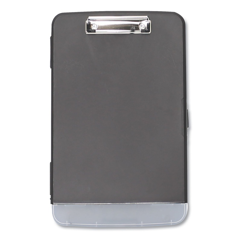 Portable plastic-molded storage box with low-profile clipboard. Snap closure keeps documents and forms safe and secure, even on-the-go. Separate smaller compartment holds pens, clips and other small items. Corner grips help prevent snags and tears. Smooth writing surface flips open from the side. Plastic is impact- and water-resistant. Holds Paper Size: 8.5 x 11; Clipboard Actual Size: 9.75 x 14; Clipboard Material: Plastic; Clip Capacity: 0.5″.
