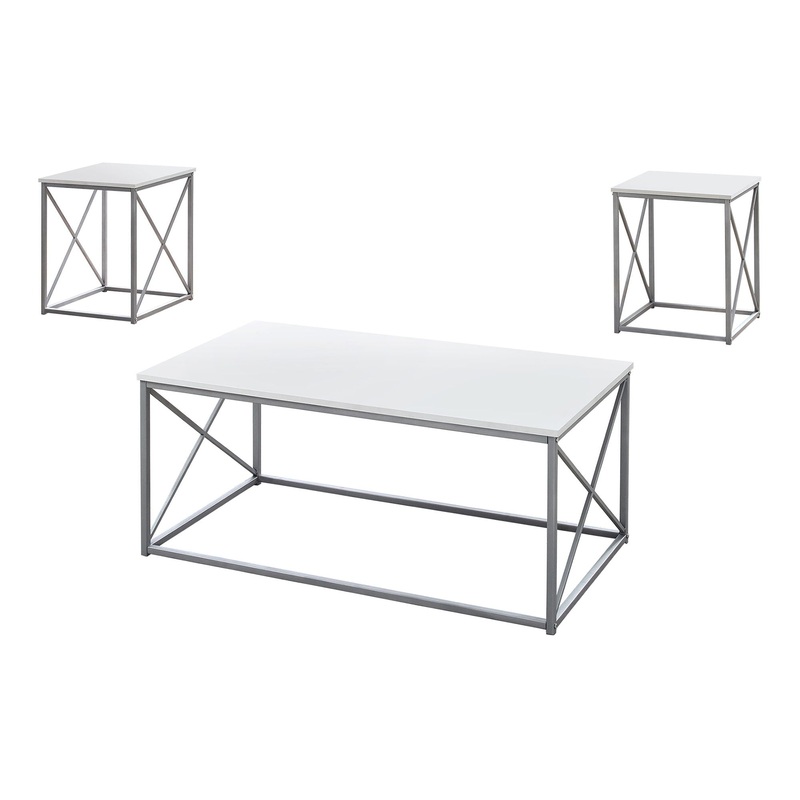 Complete Set: 3-piece table set includes a coffee table and two matching end tables, perfect for living rooms. Modern Design: Features a sturdy silver metal X design frame that adds a contemporary touch to any space. Ample Surface Space: Provides plenty of