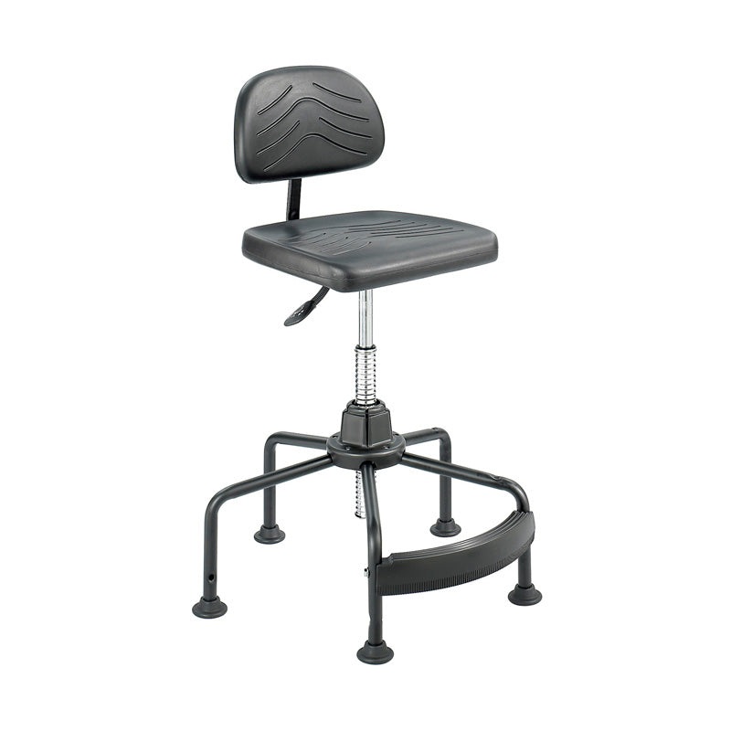 Hang tough with the TaskMaster Economy Industrial Chair. With a 15 year warranty it offers an overall height of 17″ to 35″ with an 8″ pneumatic lift and an additional 10″ of Wave Tube Extension. 360 swivel. Ergo knob controls for 3″ backrest depth and 3″ backrest height adjustment. Each chair features a 5-leg, 26″ dia. tubular steel base with 2-1/2″ high-impact nylon glides for safety and stability. Sturdy, ergonomically correct low-rung polypropylene footrest mounts securely to base. The chair also features a black microcellular, self-skinning polyurethane foam covering. Assembly required. Weight capacity is 250 lbs.