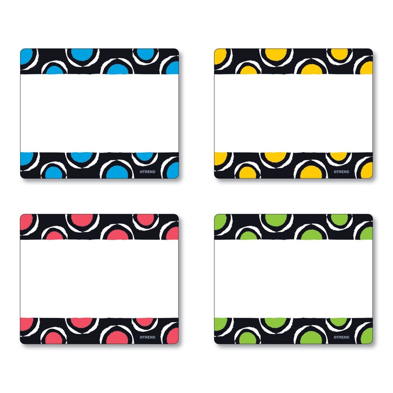 Colorful and bright adhesive labels. Designed for smear-free writing with markers or pens. Coordinates well with other TREND themed products featuring Discovering Dinosaurs, Sea Buddies, Sock Monkeys and more. Perfect for personal name tags or labeling loc
