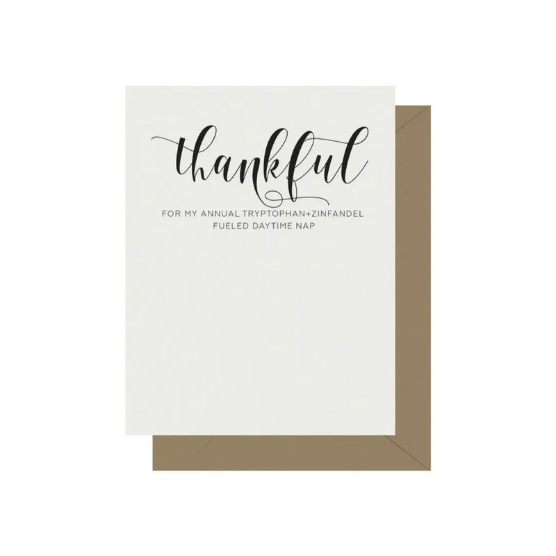 Thankful funny crass calligraphy letterpress Thanksgiving card.Size: A2 greeting card (4-1/4" x 5-1/2").Inside: Blank.Paper: 110# cotton stock.Envelope: Brown bag kraft envelope (70# stock, 100% post-consumer waste).All Letterpress Jess greeting cards are