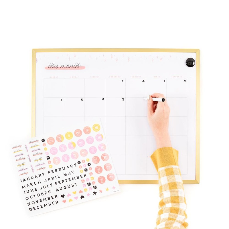 Stay on track all month with this convenient dry erase board. Decorated with minimalist styling and gold finishes, it comes to life with the pink accents and fun decals. The removable decals include an assortment of month labels and reminder icons for appo