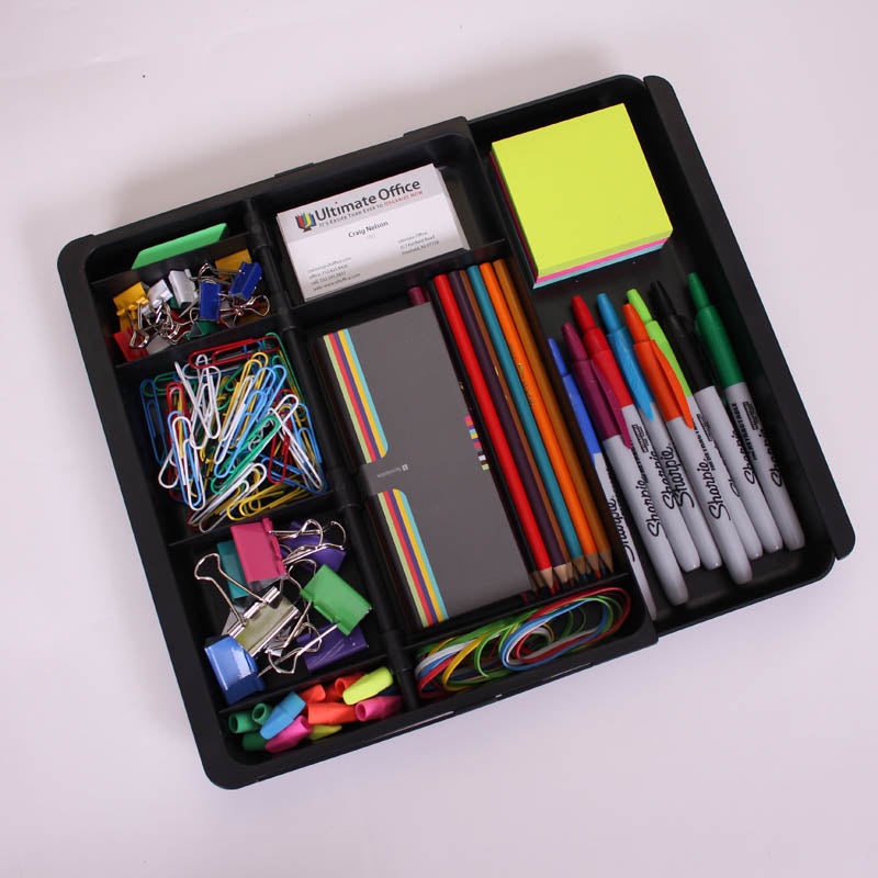 Adjustable width AND compartment sizesOur Adjustable Drawer Organizer features a unique, sliding compartment, making the unit adjustable from 9 5/8″ wide for most desktop drawer units, to as much as 15 1/2″ wide for pedestal files. Two partial width and two full width dividers slide to create 8 adjustable compartments, neatly storing small items like paperclips and erasers, to longer items like pens and highlighters. Expanding the unit reveals a full-depth, 9th compartment for storing even bigger accessories like staplers, scissors, and Post-Its.