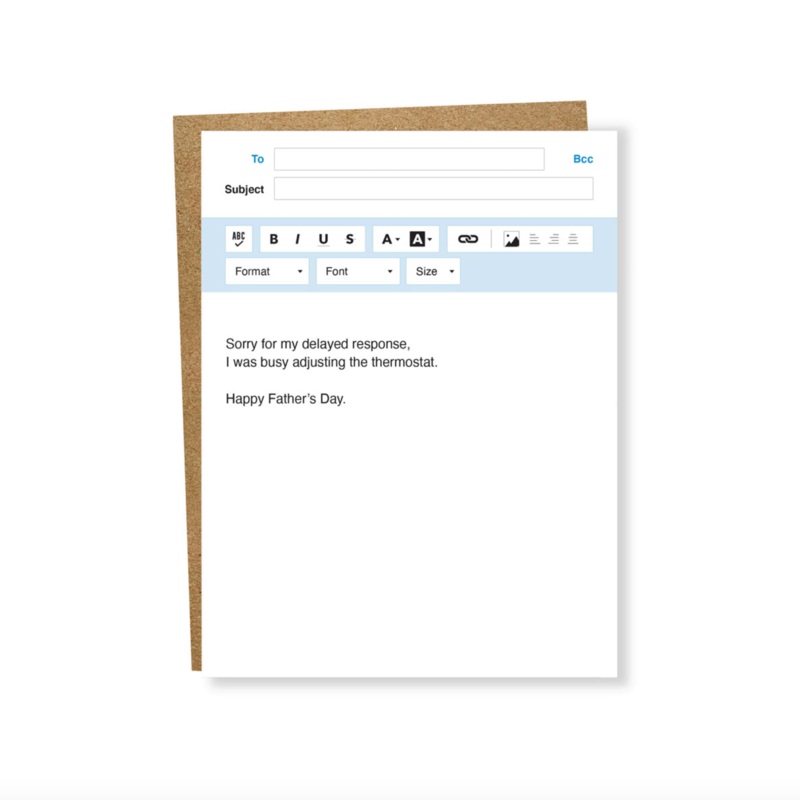 Sorry for my delayed response, I was busy adjusting the thermostat. Happy Fathers Day.Size: 4.25 x 5.5Inside Message: blankPaper: white cottonEnvelope: brown bagPrinting: letterpressInk: black blue