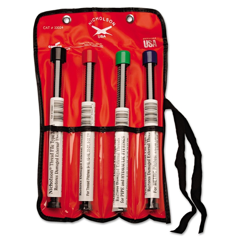 Each thread restoring file will work with 8 different thread sizes. Caps are color coded. Restores damaged or worn external threads on bolts, pipes, and more. Works with 8 different thread sizes.