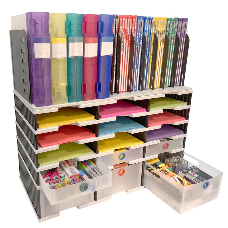 FeaturesEVERYTHING YOU NEED IN ONE COMPACT, MODULAR SYSTEM - Overall unit measures just 28 1/2"w x 26 3/4"h x 13"d. Combines 12 letter tray compartments PLUS a Riser Storage Base, a Vertical File, and 3 Supply amp; 3 Storage Drawers into one compact organi