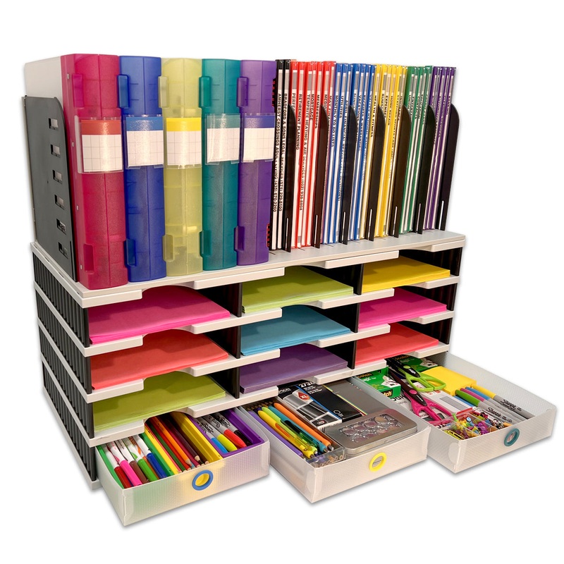 EVERYTHING YOU NEED IN ONE COMPACT, MODULAR SYSTEM – Overall Unit Measures just 28 1/2″w x 21 1/4″h x 13″d. Combines 12 letter tray compartments, a Vertical File, and 3 Storage Drawers into one compact organizer. Letter Tray Compartments each measure 9 1/16″w x 2 1/4″h x 12 3/4″d. Vertical File dividers adjust in 1″ increments, and keep all of your binders, notebooks, files, and magazines neat and upright.