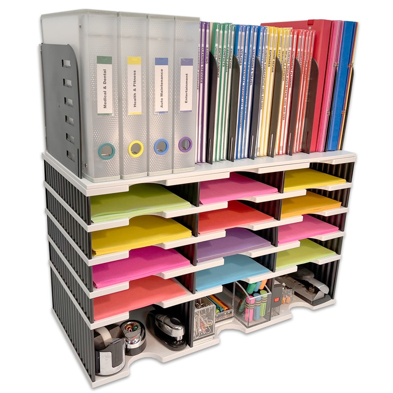 FeaturesEVERYTHING YOU NEED IN ONE COMPACT, MODULAR SYSTEM - Overall unit measures just 28 1/2"w x 26 3/4"h x 13"d. Combines 12 letter tray compartments PLUS a Riser Storage Base, and a Vertical / Hanging File into one compact organizer. Letter Tray Compar
