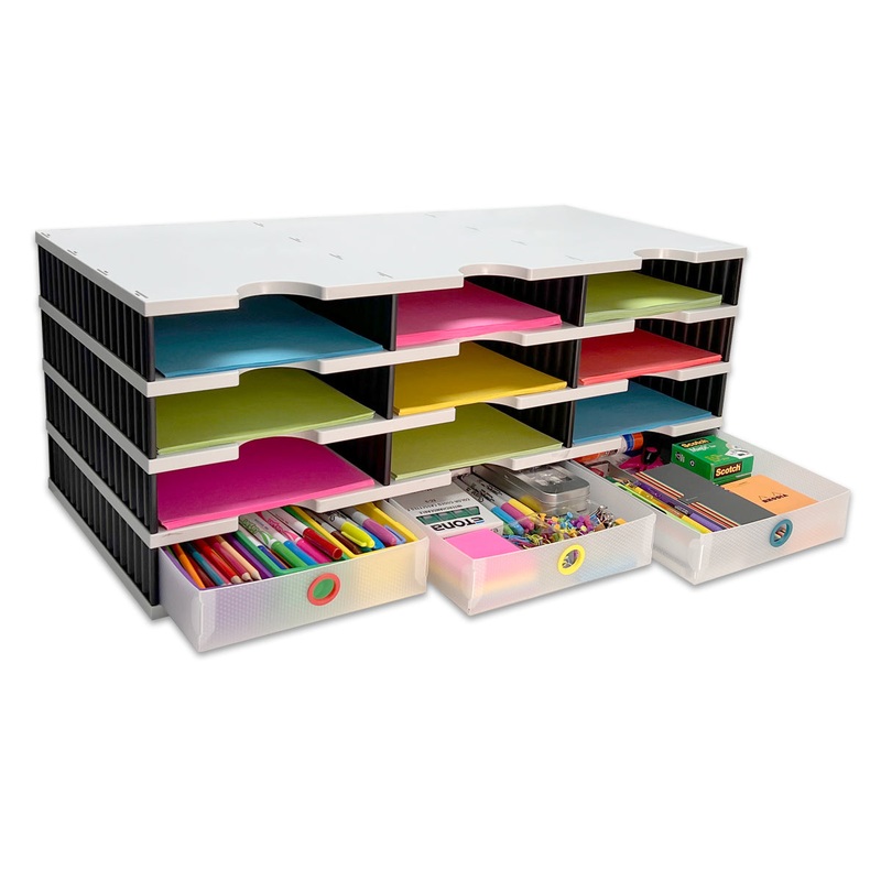 COMPACT DESKTOP EXPANDABLE ORGANIZER – Overall Unit Measures just 28 1/2″w x 12″h x 13″d. Combines12 letter tray compartments, and3 Supply Drawers into one compact desktop organizer. Letter Tray Compartments each measure 9 1/16″w x 2 1/4″h x 12 3/4″d.