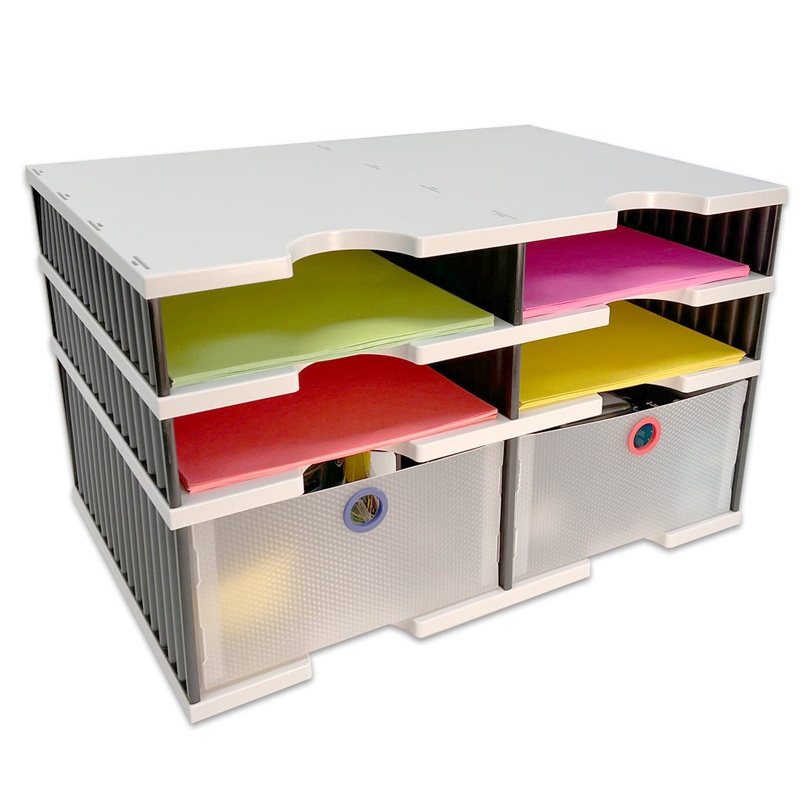 FeaturesEVERYTHING YOU NEED IN ONE COMPACT, MODULAR SYSTEM - Overall Unit Measures just 19 1/8"w x 11 1/2"h x 13"d. Combines 4 letter tray compartments, 2 Storage Drawers, and a Riser Storage Base into one compact organizer. Letter Tray Compartments each m