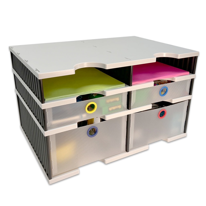 FeaturesEVERYTHING YOU NEED IN ONE COMPACT, MODULAR SYSTEM - Overall Unit Measures just 19 1/8"w x 14 1/4"h x 13"d. Combines 6 letter tray compartments, 2 Supply amp; 2 Storage Drawers, and a Riser Storage Base into one compact organizer. Letter Tray Compa