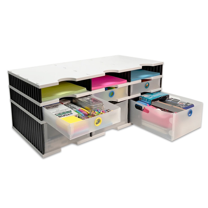 FeaturesEVERYTHING YOU NEED IN ONE COMPACT, MODULAR SYSTEM - Overall Unit Measures just 28 1/2"w x 11 1/2"h x 13"d. Combines 6 letter tray compartments, 3 Supply amp; 3 Storage Drawers, and a Riser Storage Base into one compact organizer. Letter Tray Compa