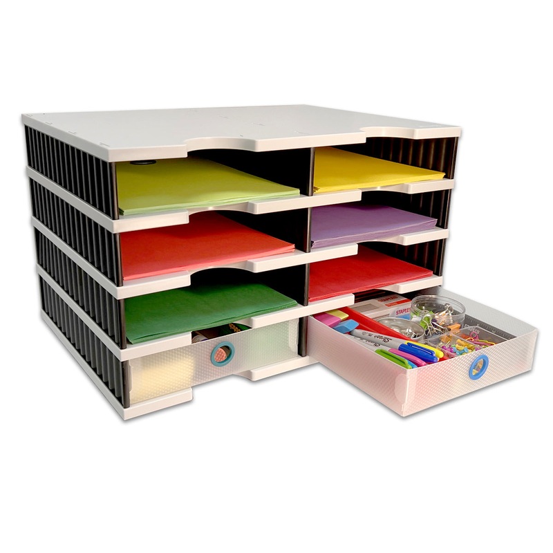 COMPACT DESKTOP EXPANDABLE ORGANIZER – Overall Unit Measures just 19 1/8″w x 12″h x 13″d. Combines8 letter tray compartments, and 2 Supply Drawers into one compact desktop organizer. Letter Tray Compartments each measure 9 1/16″w x 2 1/4″h x 12 3/4″d.
