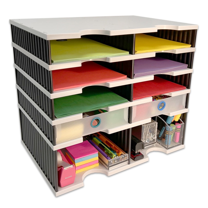FeaturesEVERYTHING YOU NEED IN ONE COMPACT, MODULAR SYSTEM - Overall Unit Measures just 19 1/8"w x 17"h x 13"d. Combines 8 letter tray compartments, 2 Supply Drawers, and a Riser Storage Base into one compact organizer. Letter Tray Compartments each measur