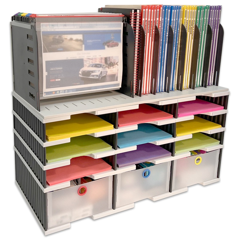 FeaturesEVERYTHING YOU NEED IN ONE COMPACT, MODULAR SYSTEM - Overall unit measures just 28 1/2"w x 24"h x 13"d. Combines 9 letter tray compartments PLUS a Riser Storage Base, a Hanging amp; Vertical File, and 3 Storage Drawers into one compact organizer. L