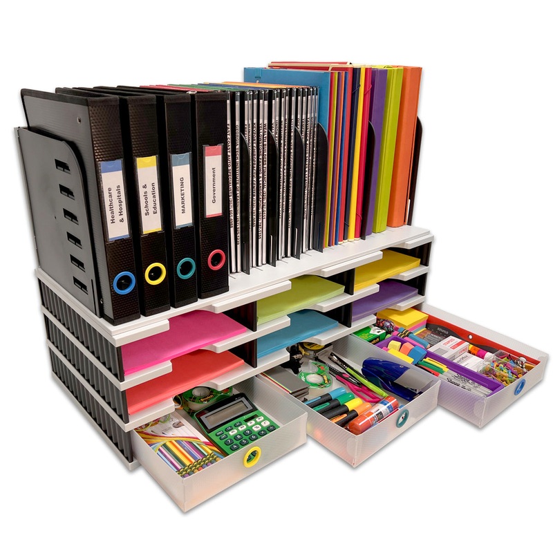 EVERYTHING YOU NEED IN ONE COMPACT, MODULAR SYSTEM – Overall Unit Measures just 28 1/2″w x 18 1/2″h x 13″d. Combines 9 letter tray compartments, a Vertical File, and 3 Storage Drawers into one compact organizer. Letter Tray Compartments each measure 9 1/16″w x 2 1/4″h x 12 3/4″d. Vertical File dividers adjust in 1″ increments, and keep all of your binders, notebooks, files, and magazines neat and upright.