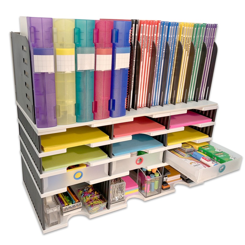 FeaturesEVERYTHING YOU NEED IN ONE COMPACT, MODULAR SYSTEM - Overall unit measures just 28 1/2"w x 24"h x 13"d. Combines 9 letter tray compartments PLUS a Riser Storage Base, a Vertical File, and 3 Supply Drawers into one compact organizer. Letter Tray Com