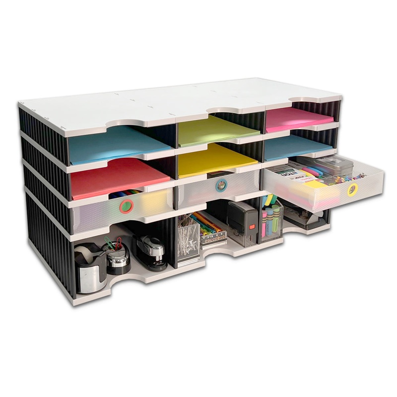 FeaturesEVERYTHING YOU NEED IN ONE COMPACT, MODULAR SYSTEM - Overall Unit Measures just 28 1/2"w x 14 1/4"h x 13"d. Combines 9 letter tray compartments, 3 Supply Drawers, and a Riser Storage Base into one compact organizer. Letter Tray Compartments each me