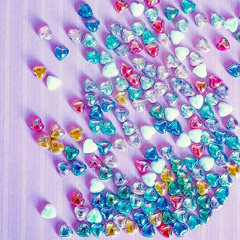 The small sparkly/pearly acrylic heart flat backs measure 5mm across the widest part. You will receive a mixed bundle of 25.