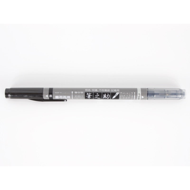 Tombow Fudenosuke Dual Tip brush-style lettering pen has two firm sides, a black and a 'light black' (gray) side. Water-based pigmented ink, fine brush-style tip made of recycled polypropylene plastic.