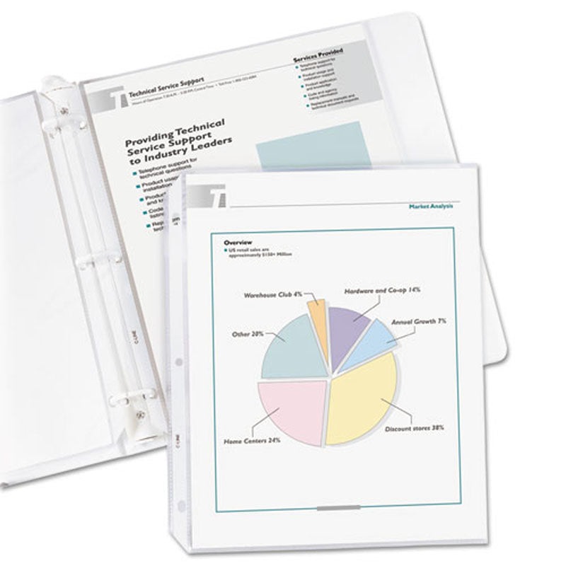 FeaturesStrong, reinforced binding edges.Top loading design.No sheet punching necessary.Acid free, archival quality polypropylene.Eliminates photocopy transfer.Preserves documents in standard binder.DetailsStrong, reinforced edges prevent tears. Top-loadin