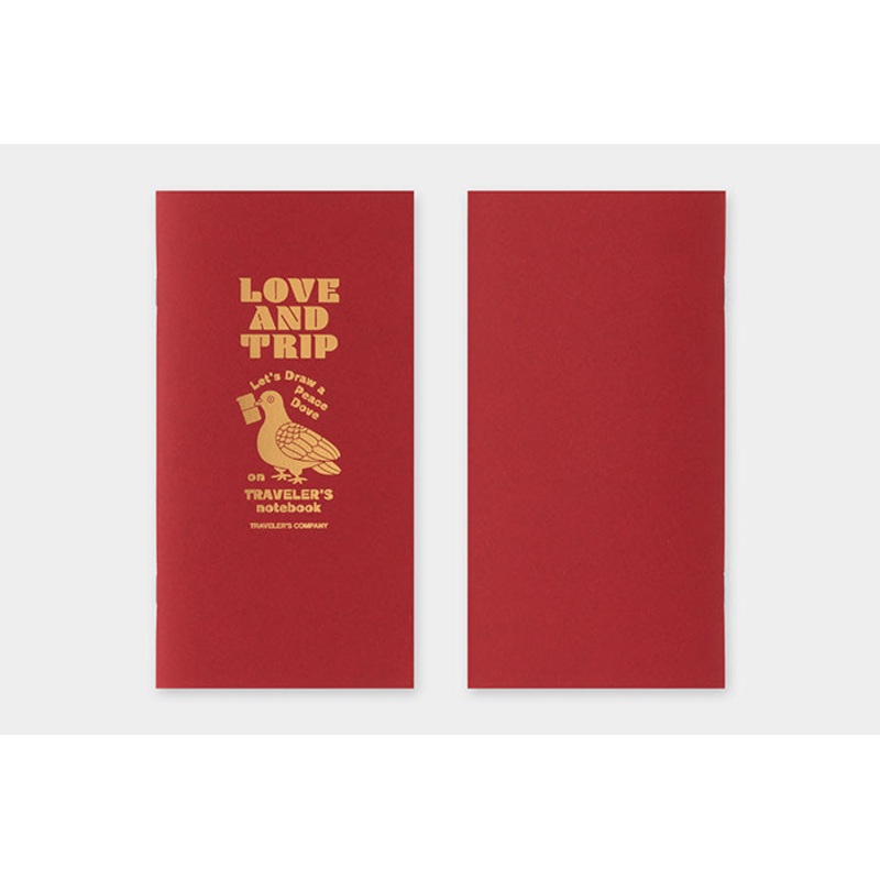 A TRAVELERS notebook refill created under the theme of LOVE AND TRIP. It features a red cover with a LOVE AND TRIP-themed design stamped in foil. In addition to MD PAPER Cream, the first and last pages are perforated massage cards, letterpress printed on the theme of LOVE AND TRIP. A great way to express yourself whether youre traveling or at home! Keep these in your Traveler’s Notebook and give them to people to express gratitude or kind wishes. The unique texture of letterpress printing is also attractive.