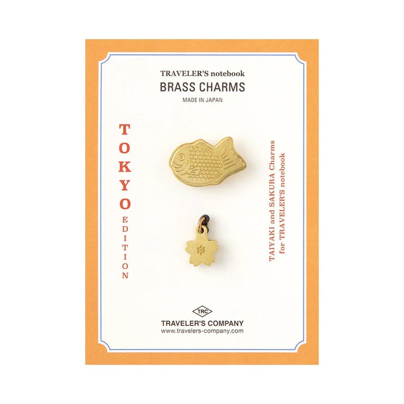 This TRAVELERS Company Limited Edition Brass Charm complements the Tokyo collection perfectly. Crafted from brass, it showcases iconic Tokyo treatstaiyaki, a beloved snack, and sakura blossoms celebrated in spring. The taiyaki charm slides smoothly along your notebooks elastic, while the sakura charm attaches to the bookmarks string or elastic for added elegance. Over time, the brass develops a rich patina, enhancing its character and making it a unique accessory for your Tokyo notebook. Add a distinctive touch that reflects the spirit of Tokyo wherever you go.