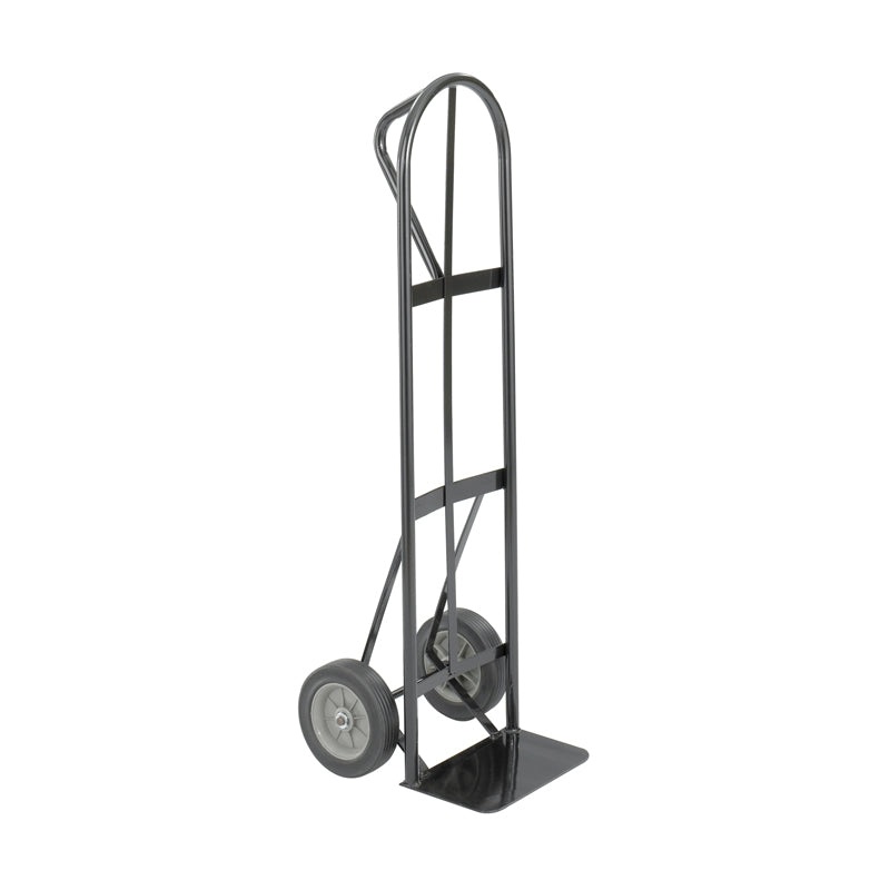 DetailsHeavy gauge tubular steel frame with welded joints for extra strength. 14" x 7" toe plate and 8" solid rubber wheels with ball bearings. Black baked enamel finish. Shipped fully assembled.DimensionsProduct Dimension: 16"w x 16 1/4"d x 51 1/2"h