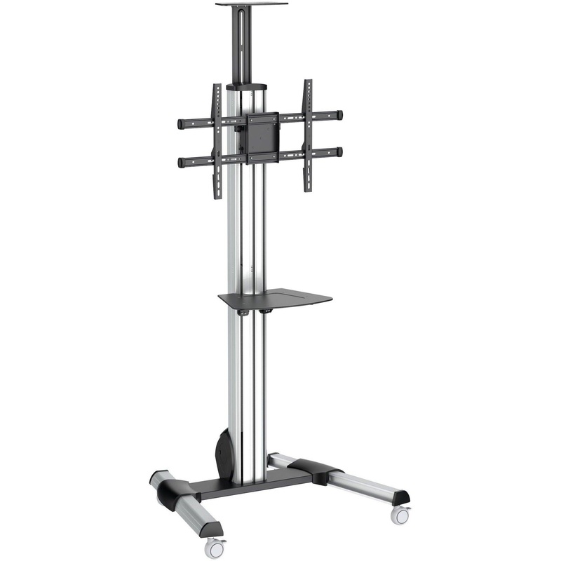 This portable TV cart makes it easy to create a mobile media center, providing a convenient and cost-effective way to share A/V equipment between rooms. Engineered with a sleek and sturdy design, the TV cart provides a secure mount for a 32″ to 75″ TV (with maximum weight of 88 lb./40 kg) and a removable multi-media shelf for placing your computer, media player or keyboard. It also includes a camera shelf for web-conferencing.