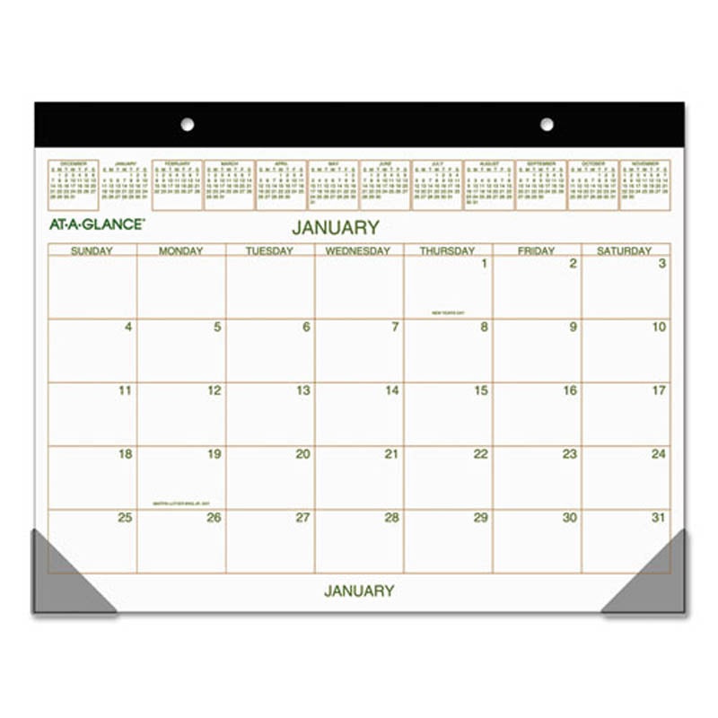 FeaturesOpen writing space for each day with full-year reference calendar across the top.Durable backboard for sturdy writing surface.Includes bonus page with future year reference.One month per page with unruled blocks.Black, wide paper headband with eyel