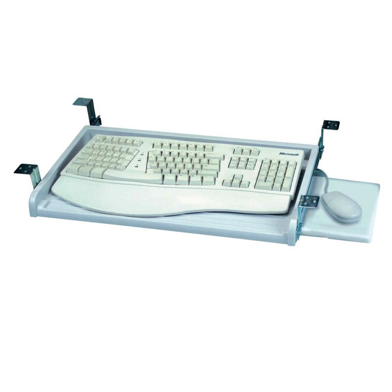 Under-Desk Keyboard Tray with Mouse PadThis Keyboard Tray is precision-molded from rugged polystyrene to withstand years of use. Tray slides in and out on ball bearing glides, keeping your desktop clear and clutter-free. Slide-out mouse platform can be installed for left- or right-hand use. Molded slots keep writing implements handy. Mounting hardware included.