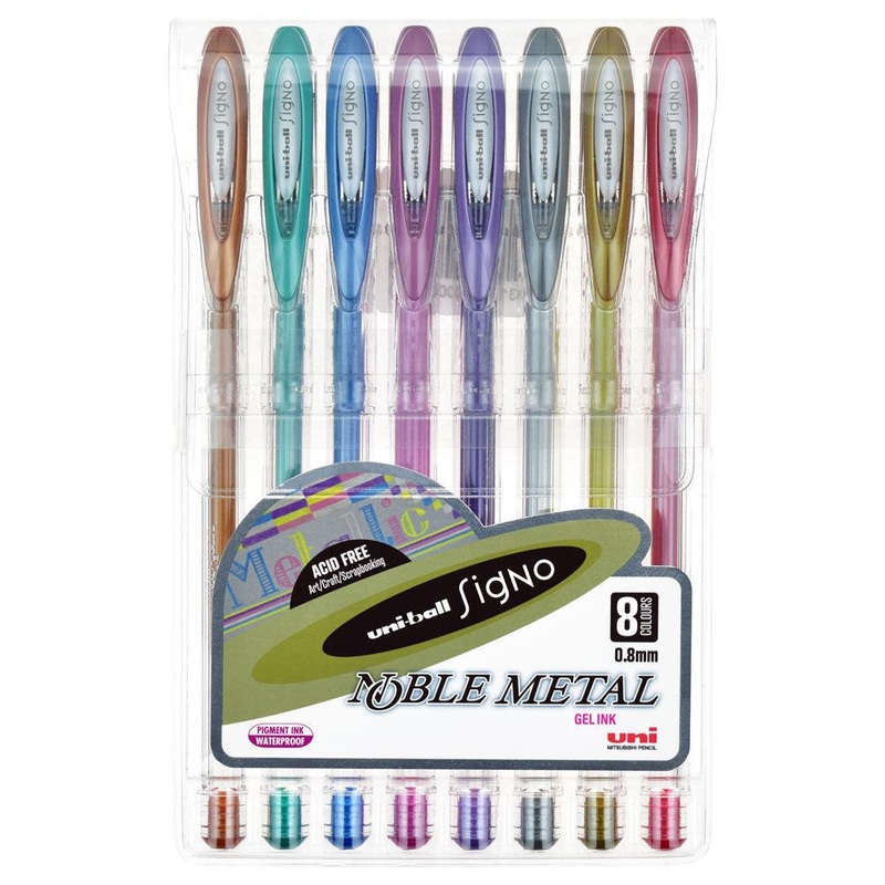 These Uni-Ball Signo Noble Metallic Gel Pens allow you to write in vibrant, shiny colours. You can use them to add some colour to your everyday writing or in scrapbooking or art and craft applications. *Each pen has a 0.8 mm nib. *They contain shiny, metal