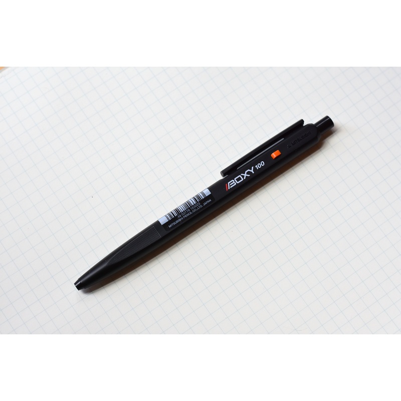 Uni Boxy 100 Ballpoint Pen was released by Uni Mitsubishi Pencil Co. in 1975 along with a complete line of Boxy stationery including other writing instruments, scissors, staplers, folders and many other stationeries. One look at the pen will definitely transport you to a different decade–with its rectangular shape,clean edges and lines, and brightly colored accent details, we are always reminded of vintage Nintendo gaming systems and old school computers when looking at the pen. At the time the pen was first released, it was quite different from most other pens that were popular since many of the mainstream pens were more frilly and decorated while the Boxy is very simple. Its body is almost completely black except for the retracting button which is bright orange and the name of the pen which is in white. The pen has a box-like rectangular shape with rounded corners and is extremely lightweight, making it very comfortable for you to hold in your hand when writing.