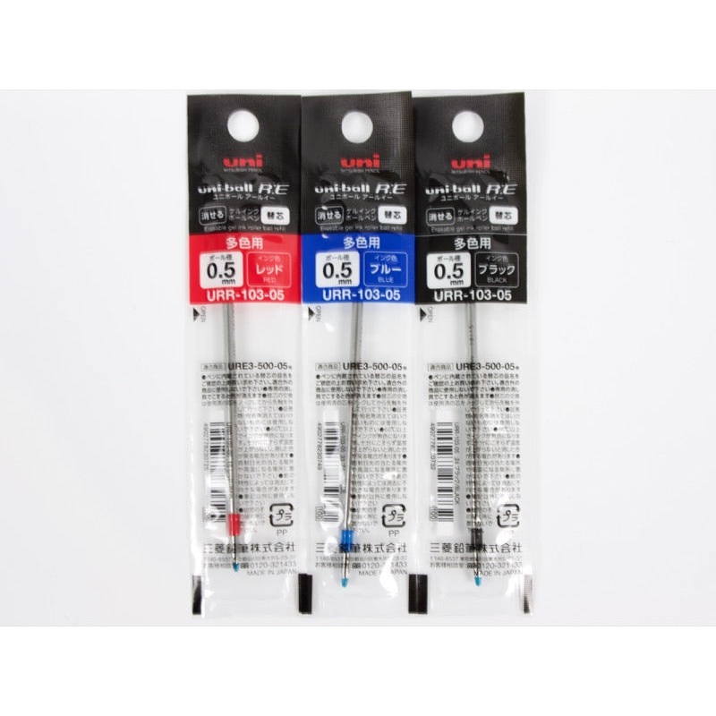 The URR-103 is an erasable gel ink refill that fills the Uniball RE3. .5mm Tip Size.Available in Off Black, Cobalt Blue, or Rose Red.