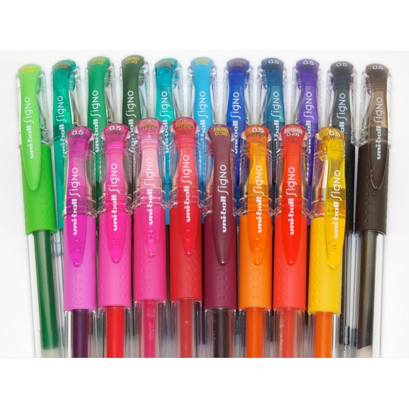 The Uniball Signo DX, a Japanese gel ink pen in .28, .38, and .5, writes smoothly to create bold colorful strokes. This pen also happens to be my absolute favorite Japanese gel pen. I have been using the bordeaux-black and brown-black regularly since 2000. I find the tips to be stronger than most gel pens, which is important to ‘heavy-writers’ like myself. Please see details below regarding the discontinued colors. Some of these are still available on our shop as a last chance opportunity!