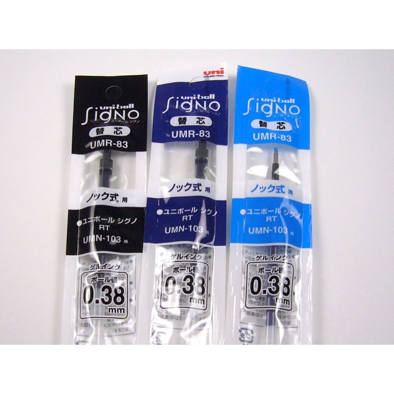 The UMR-82 and UMR-83 refills are intended for the Uniball Signo RT or the Uniball Signo RT1. Please choose blue, black, blue-black, or red. Available in a .28 or .38 mm tip size.