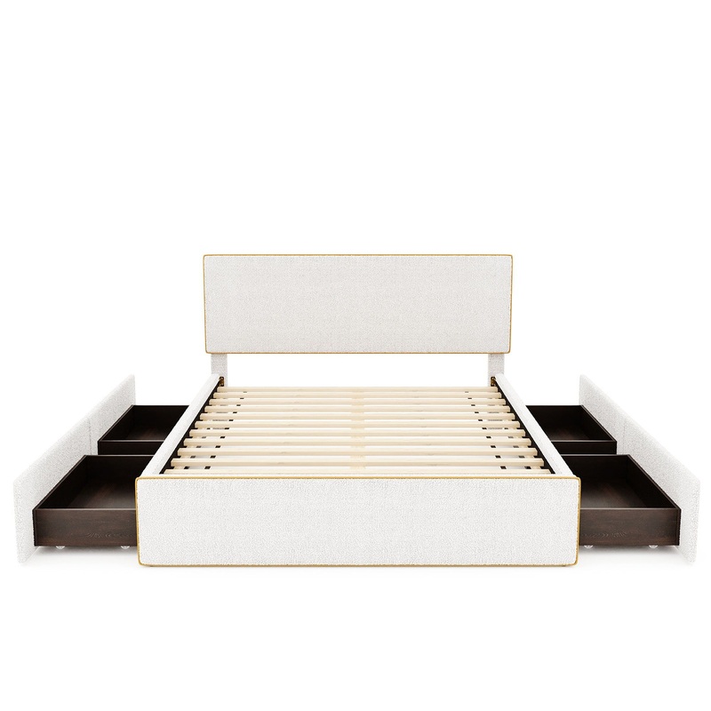 Queen Size Upholstered Platform Bed With 4 Drawers And Golden Edge On The Headboard & Footboard – White