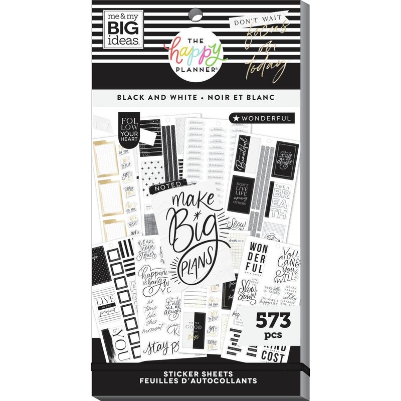 Make big plans. Made for the minimalist, these black and white stickers will decorate your spread and add function to your Happy Planner. It has a mixture of inspirational quotes, icons, and boxes to write memos and reminders. It features simple prints and